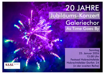 Unter dem Motto "As Time Goes By" lädt der Galeriechor gemeinsam mit dem SaalKultur e. V. am 25. Januar um 15.00 Uhr zu einem Jubiläumskonzert im Festsaal Hobrechtsfelde. Mit dem Konzert feiert der Chor, der sich im Jahr 2005 in Wilfried Staufenbiels Galerie im Hühnerstall in Schönow gegründet hat, seinen runden Geburtstag.