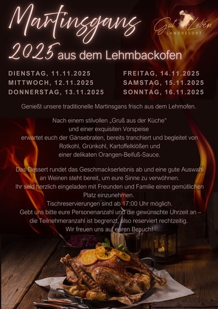Genießt unsere traditionelle Martinsgans frisch aus dem Lehmofen.